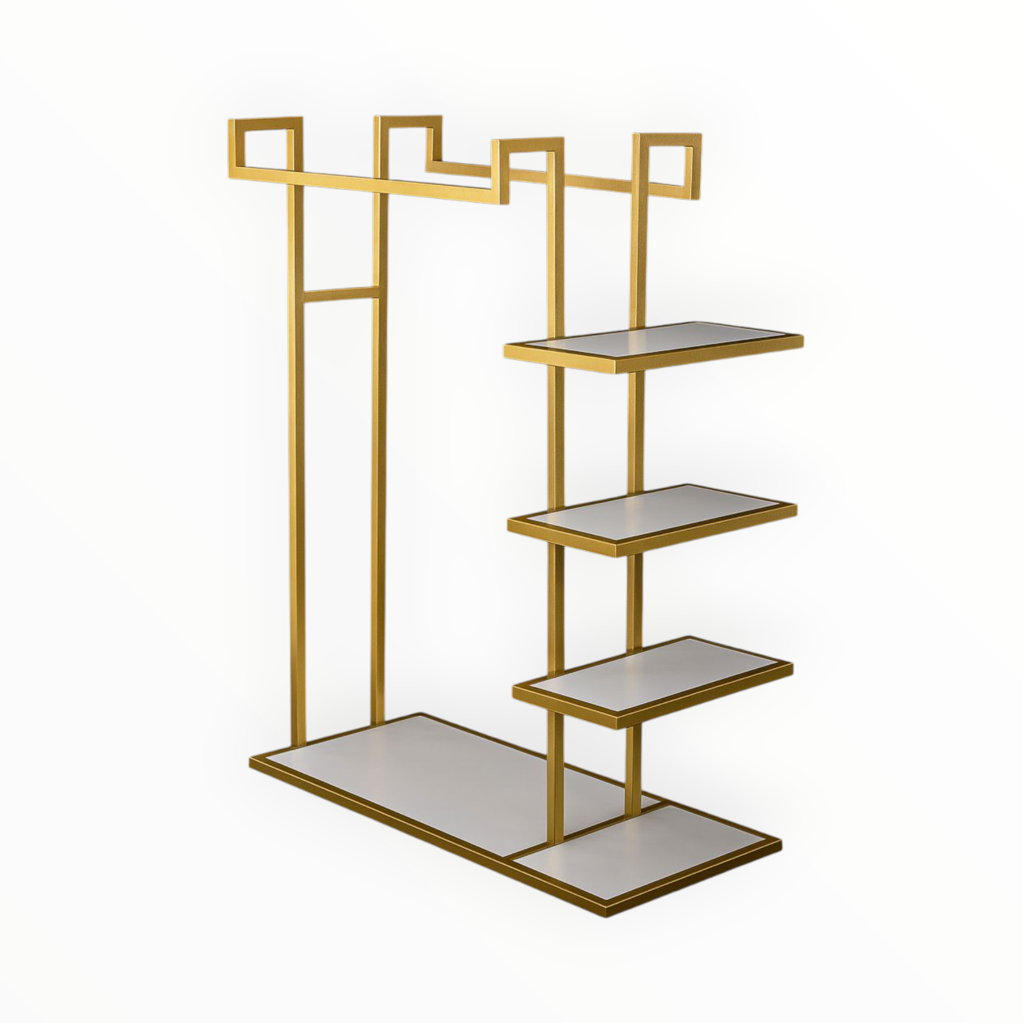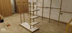 استاند ملابس زوجي بتشطيب ذهبي عصري ورفوف متعددة، مناسب لعرض الملابس الرجالي أو الزوجي داخل البوتيكات والمحلات الراقية.