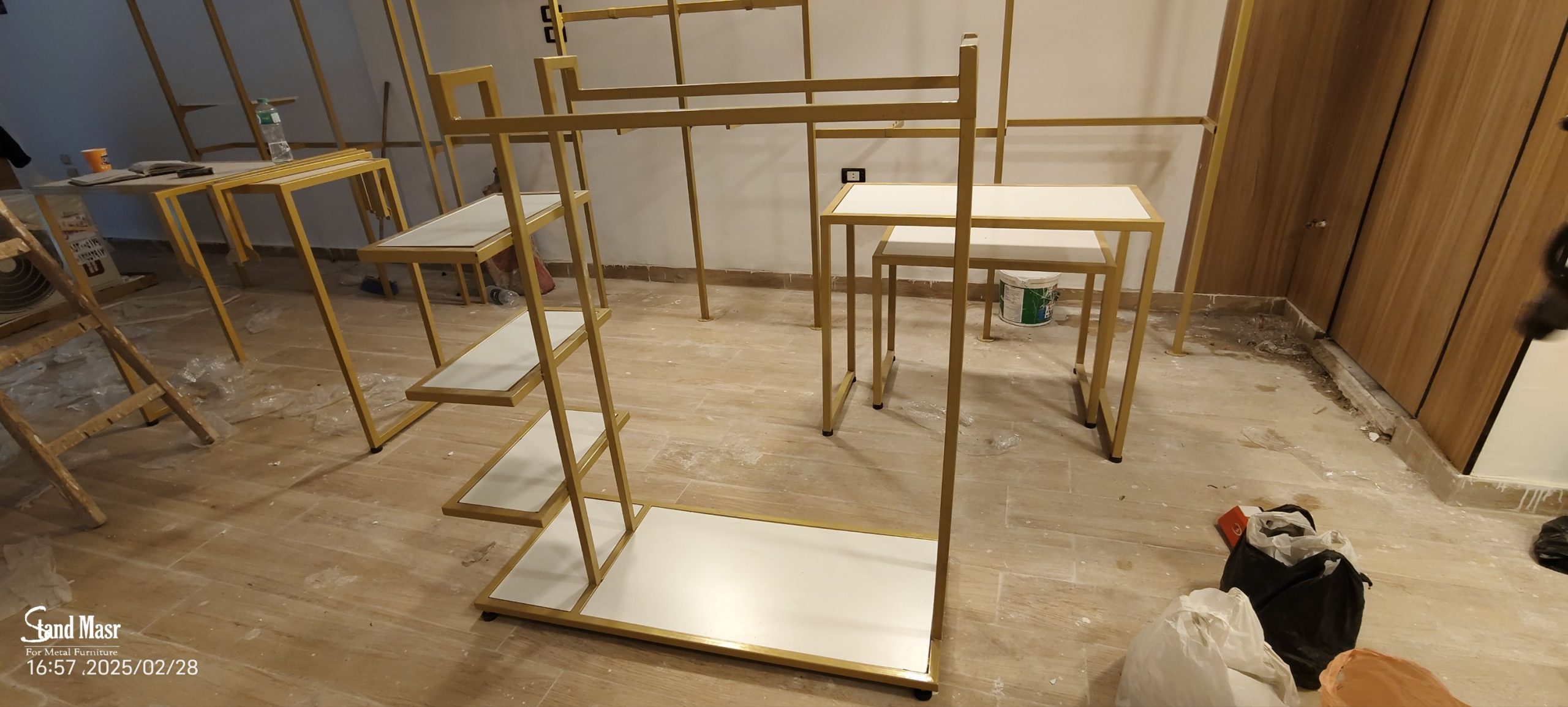 استاند ملابس زوجي – استاند عرض ملابس – استاند بوتيك – تجهيز محلات – استاند ذهبي – عرض أطقم رجالي – Display Clothing Stand – Metal Clothing Rack