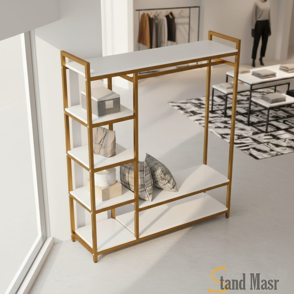 استاند عرض ملابس ديكوري مودرن فاخر مع رفوف جانبية ومرآة – تصميم هندسي معاصر من Stand Egypt